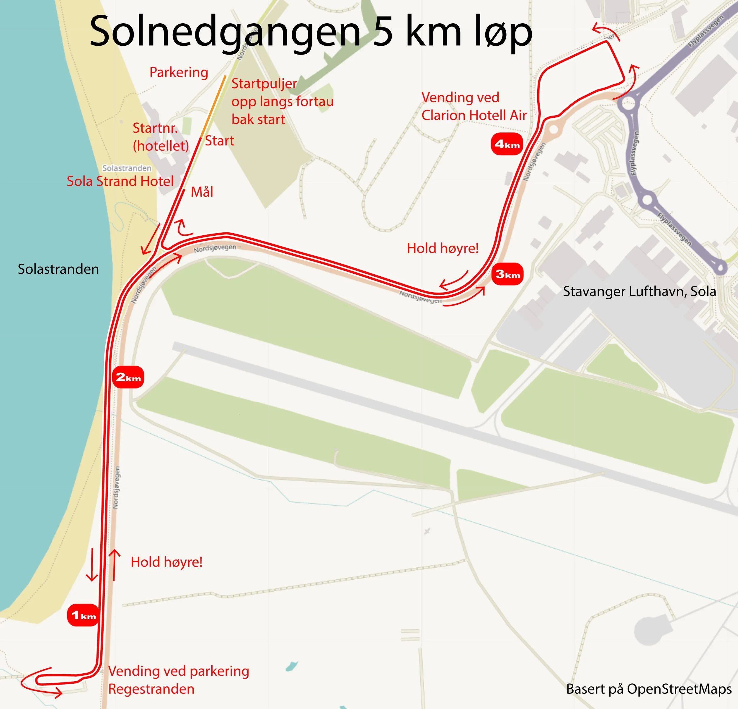 Start/mål er ved Sola Strand hotel (på fortauet utenfor ansattparkeringen).